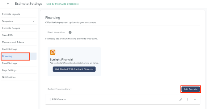 - Admins with Settings access can add Financing options by navigating to Estimate Settings and selecting the Financing option from the menu on the left.