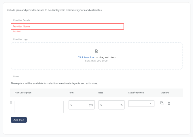 - Provide the specific details of the financing options offered by the unique provider. Once you have entered all the necessary information, click on the Add plan button and Publish the details.