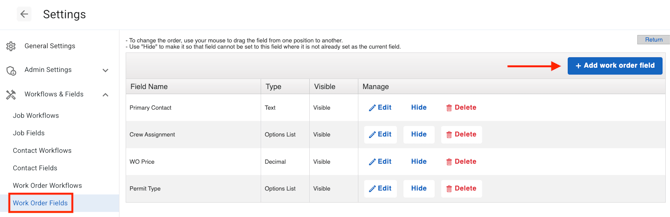 Note: Work Orders must first be enabled before you can create Custom Fields.