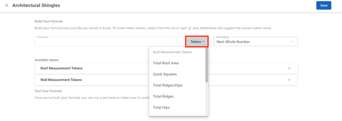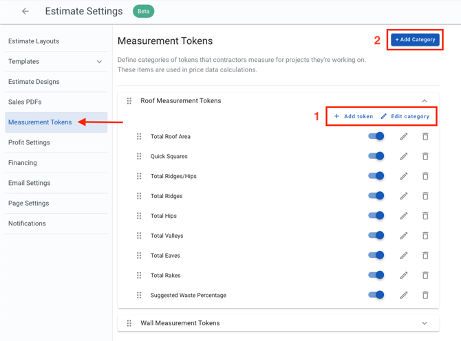 - Add tokens and edit existing categories (listed in the screenshot above as Roof Measurement Tokens and Wall Measurement Tokens).