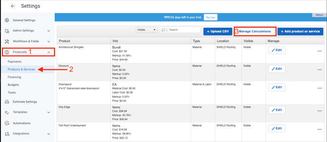 - Under the Settings menu on the left-hand side, select Financials, then select Products & Services. Once there, select Manage Calculations.