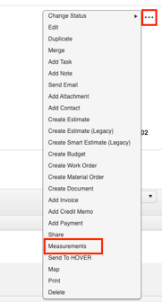 Once you have turned on the EagleView feature, proceed to your desired Job. Select the three dots in the top right of the Job and select Measurements.