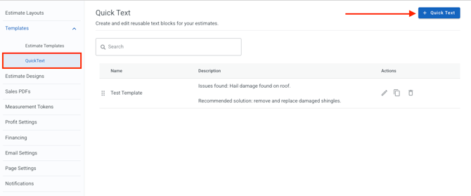 - Within the Estimate Settings, you can access your QuickText library under Templates. This is where you can manage and create new QuickText templates.