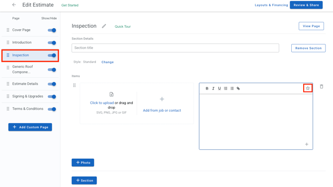 - QuickTexts can be incredibly useful when drafting the Inspection section of your estimate. Click on the star icon in the top right corner of the text box to access your template library.