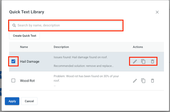 - In the library option, you can choose multiple QuickTexts and apply them to the description text box. You also have the option to create new QuickTexts and edit, copy, and delete templates directly from this window.
