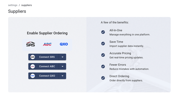 • If you already have one or more suppliers added to your JobNimbus account, select the QXO tab. Then, select the Connect QXO Account button.