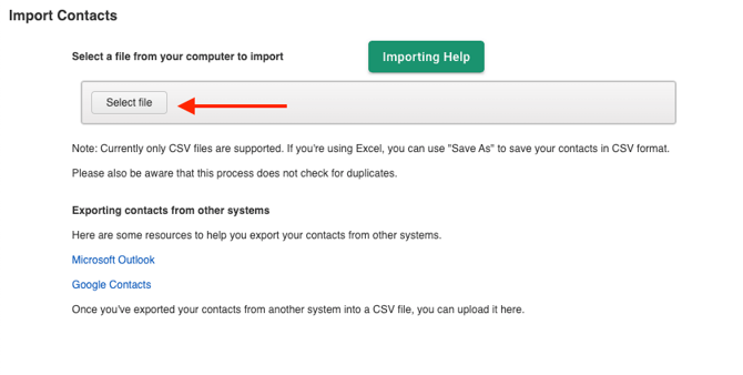 Click Select file to browse your computer for the CSV file containing your Contacts.