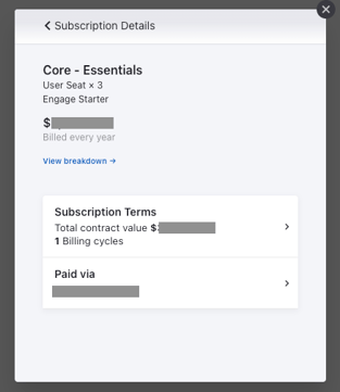 - Your subscription type and number of user seats, along with your billing total and billing frequency