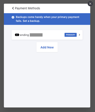 - Click on the Payment Methods button to update your current payment method or add a backup payment method.