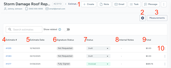 Click on the Estimates tab to view all Estimates associated with the Job. Here, you can:
