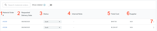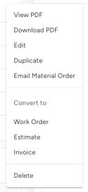- Click on the three dots to view administrative options such as editing or duplicating a Material Order, or converting it to a Work Order, Estimate, or Invoice.