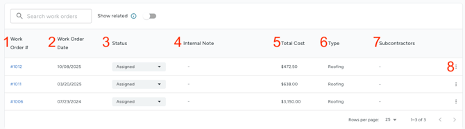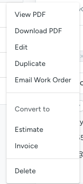 - Click on the three dots to view administrative options such as editing or duplicating a Work Order, or converting it to an Estimate or Invoice.