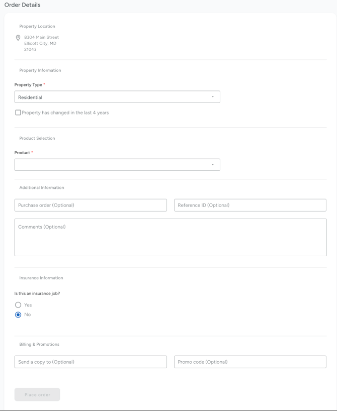 - Then, enter the Order Details in the provided fields, including the Property Type, EagleView Product, delivery option, measurement instructions, and insurance information (if applicable).