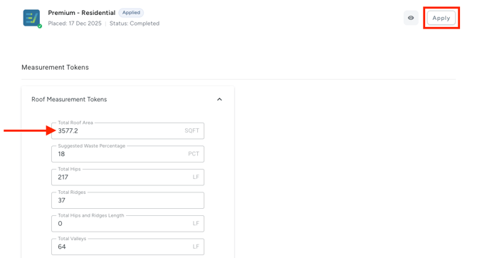 Note: In EagleView, the report owner must apply measurements in order for suggested waste percentage to show. If someone other than the person who ordered the report applies the measurements, the waste percentage will not show.