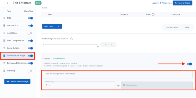 - Within the estimate that you would like to request a deposit for, select the Authorization page.