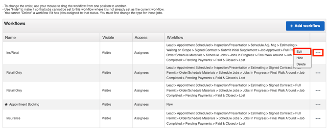 - Click on the three dots to the right of the Workflow you wish to update and choose Edit from the menu.