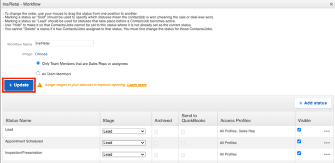 Once you have updated your Workflow's Statuses to include the desired Access Profiles, click the Update button at the top of the Workflow window to save your changes.