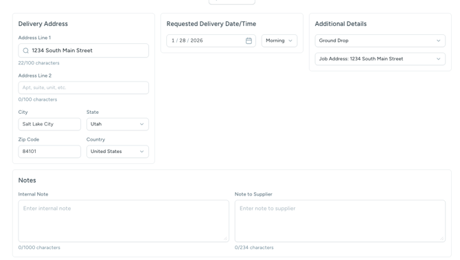 - The Delivery Address will automatically fill in the Job address, but you can edit this if needed.