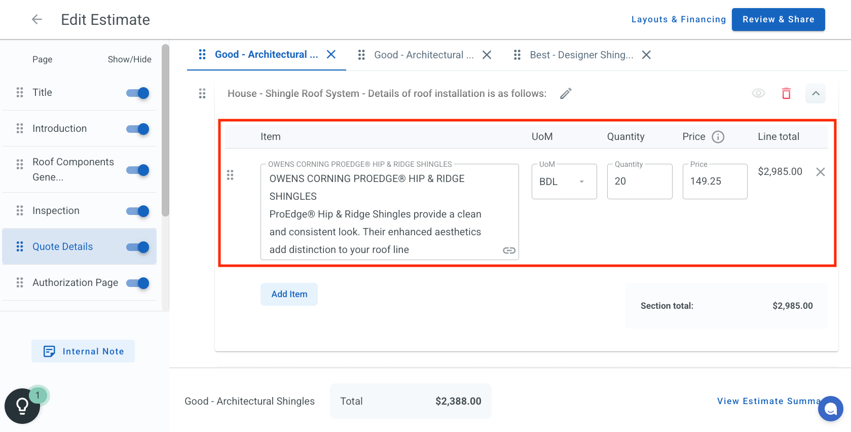 Note: You may see a Price Overide Adjustment in the total. This is due to decimal point limitations and will be displayed as a "Rounding Adjustment" on the Estimate PDF.