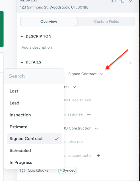 Choose a Status that you know is configured to sync to QuickBooks
