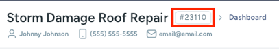 Each record created in JobsNimbus (Jobs, Contacts, Estimates, Invoices, etc.) is automatically assigned an ID number. These numbers are displayed on the header of each Job or Contact record, or in the record number column for documents such as Estimates, Invoices, Material Orders, Form responses, etc.